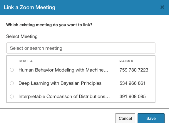 View how many sessions you have planned and exactly which ones have already been connected to a Zoom meeting. You can add sessions, delete them, and import them all in the same place. From there, these scheduled meetings will be listed in a convenient drop-down menu whenever you want to add a livestream to a session, making it so much easier to avoid mistakes than if you were pasting meeting codes or URLs!