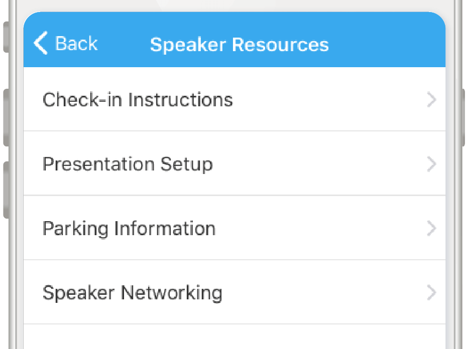 You could email this information to your speakers before the event — or you could create customized resources in the event app for your speakers. It’s quick and easy to set up, and your speakers will enjoy a more personalized and convenient experience.
