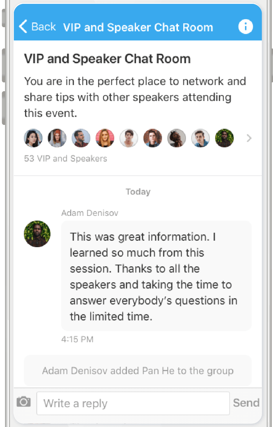 The VIP Chat Room serves an additional space for networking, where your speakers can all get to know one another and share tips. This creates an even more valuable experience at your event.