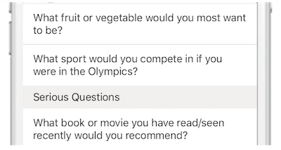 < Icebreaker in the Whova event app. Attendees can select a question to answer, which would lead to an interesting conversation with others >